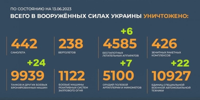 - Общие потери ВСУ с 4 июня в Минобороны России оценили в 7500 человек убитыми и ранеными, «не считая погибших военнослужащих в результате применения российского высокоточного оружия большой дальности и авиации в глубине украинской территории».