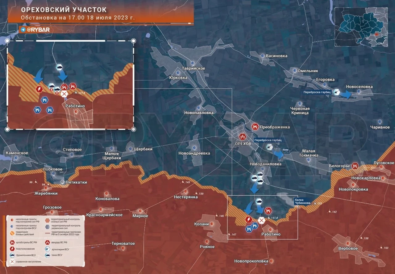 Карта боевых действий: Ореховский участок Обстановка по состоянию на 21.00 18 июля 2023 года