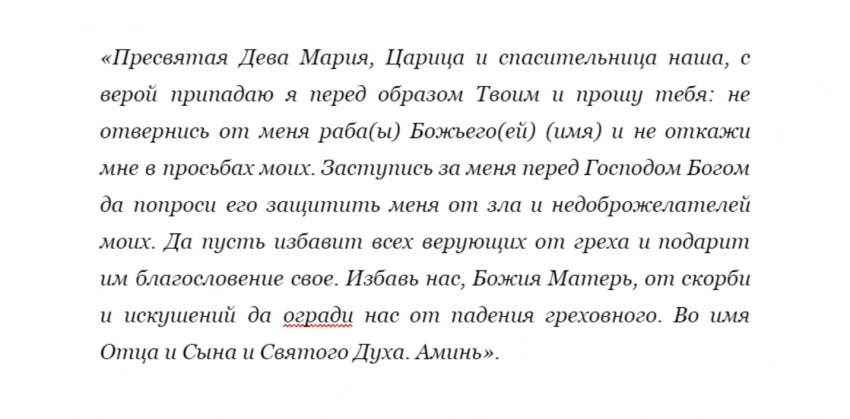 «Божия Матерь, покровительница наша, прошу тебя, возьми под защиту мою семью. Пусть любовь в сердце супруга (супруги) моего (моей) никогда не угаснет. Пусть дети будут послушными, а родители здоровыми. Защити мою семью от разлада и тех, кто желает зла родным моим. Услышь же просьбы мои, да прославим мы имя Твое. Аминь».