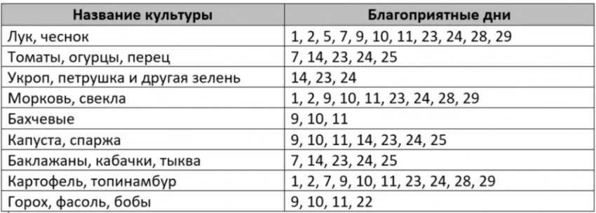 Узнать наиболее благоприятные даты для посева разных культур можно, ознакомившись с этой табличкой.