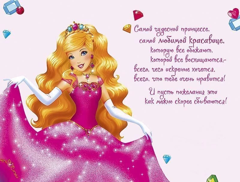 Будь красива и умна, желаем тебе, чтобы жизнь твоя была волшебной сказкой, полной разных чудес и добрых приключений. Пускай каждый новый день несет тебе только радость и счастье. Слушайся всегда своих родителей и не подводи друзей. Пускай судьба приготовит тебе много приятных сюрпризов. Когда вырастишь, ты реализуешь себя, как личность, добьешься больших успехов в карьере и любви. С праздником тебя дорогая – с Днем принцесс.