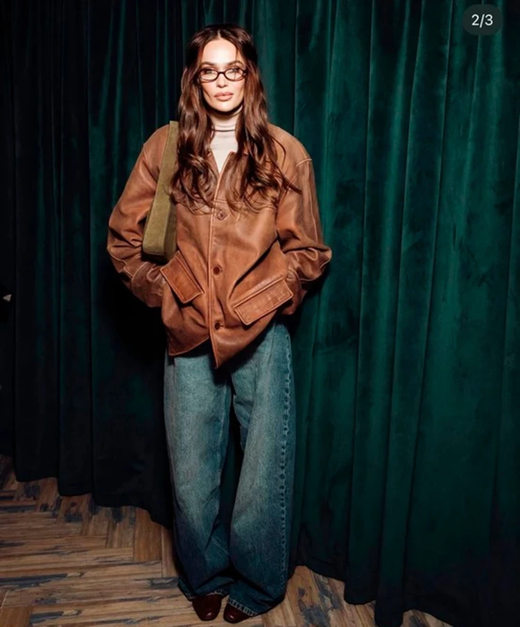 Образ Алены — мой фаворит в сегодняшней подборке. Водонаева мастерски обыграла винтажную куртку своего папы, с которой собрала очень стильный расслабленный образ. Куртку она сочетала с трендовыми широкими джинсами и бежевой водолазкой. Дополнила лук коричневыми лоферами и замшевой сумкой ультрамодного светло-зеленого оттенка. А еще мне очень нравится укладка — небрежные локоны — которая идеально завершила образ.