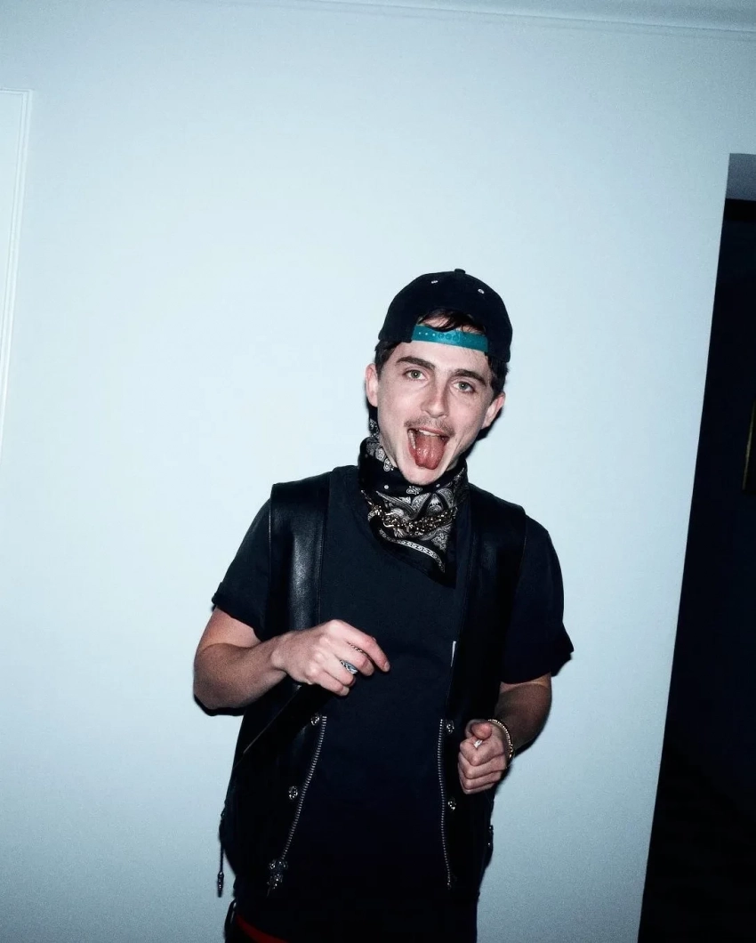 Кайли надела прозрачное чёрное кружевное платье, а Тимоти выбрал чёрную футболку, кожаный жилет и бандану. На совместном снимке пара обнималась и выглядела счастливой.