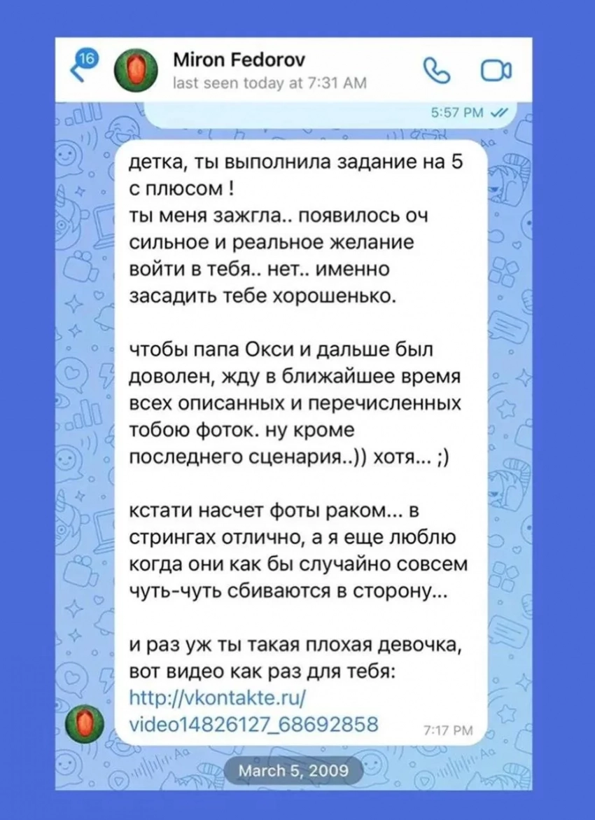 "Человек никогда даже <...> не извинился передо мной. Он растлял <...> с тринадцати? 13, 14, 15, 16 лет <...>, три года это длилось, когда я ещё училась <...> в седьмом классе. И то есть мне сейчас так мерзко смотреть, как он вот прорабатывает свою травму", — приводит Красильникова слова одной из девушек.