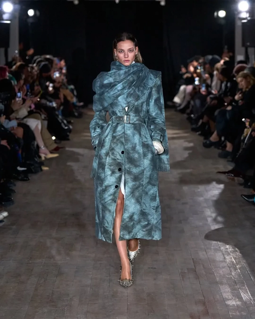 В Париже в рамках Недели моды состоялся показ осенней коллекции бренда Weinsanto. Шоу открыла Алеся Кафельникова. 26-летняя российская модель прошлась по подиуму дважды: в пальто бирюзового цвета и бархатном коротком платье с накладными карманами.