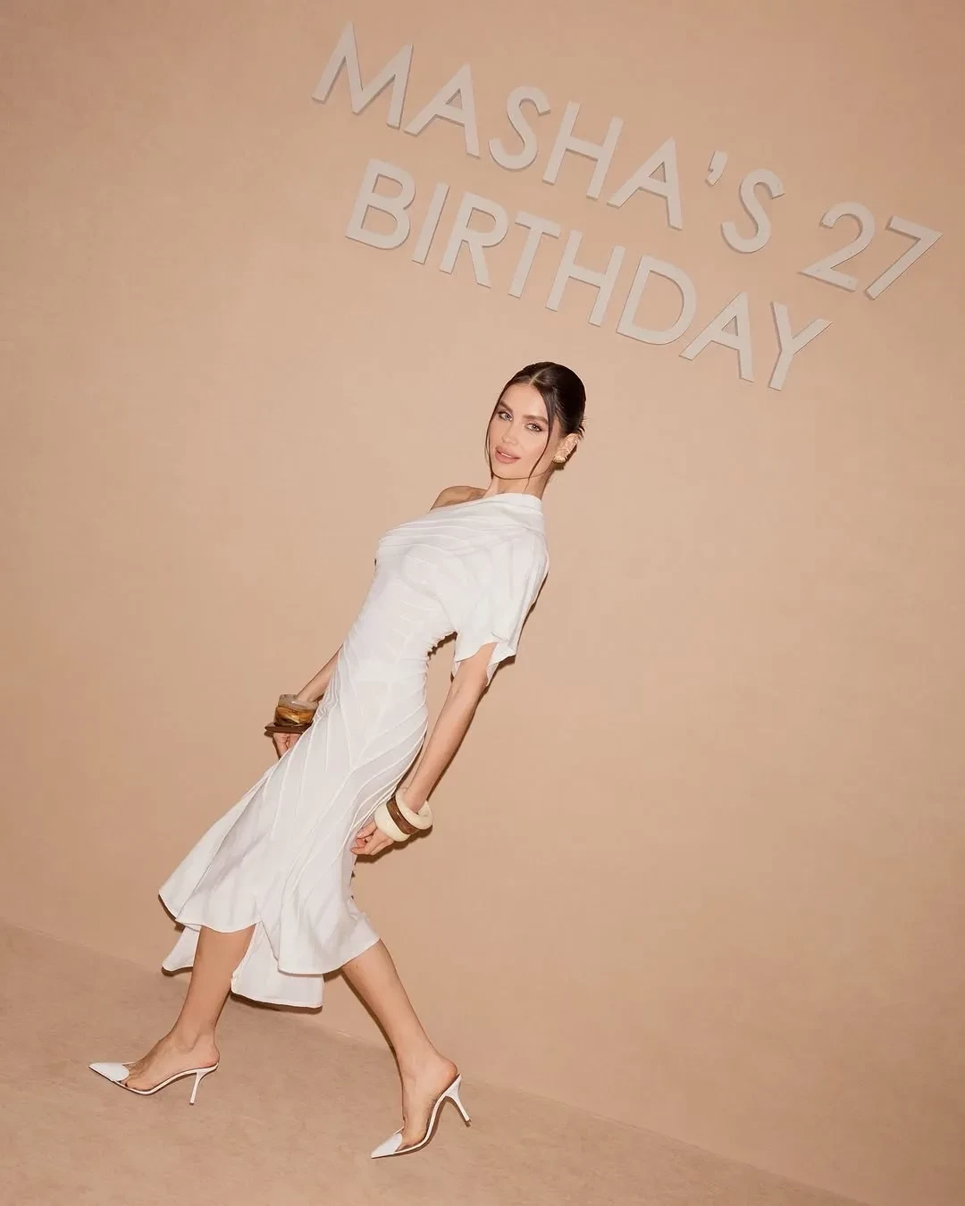 Судя по снимкам, дресс-кодом вечеринки стали чёрный и белый цвета. Мария появилась перед гостями в белом платье Alaia на одно плечо и дополнила образ массивными браслетами. Поздравить Лобанову пришла её мать Евгения и сестра Екатерина, а также основательница Дома красоты Bemônt Варвара Мазараки, визажист Валентина Гросс, модель Анастасия Бова и другие.