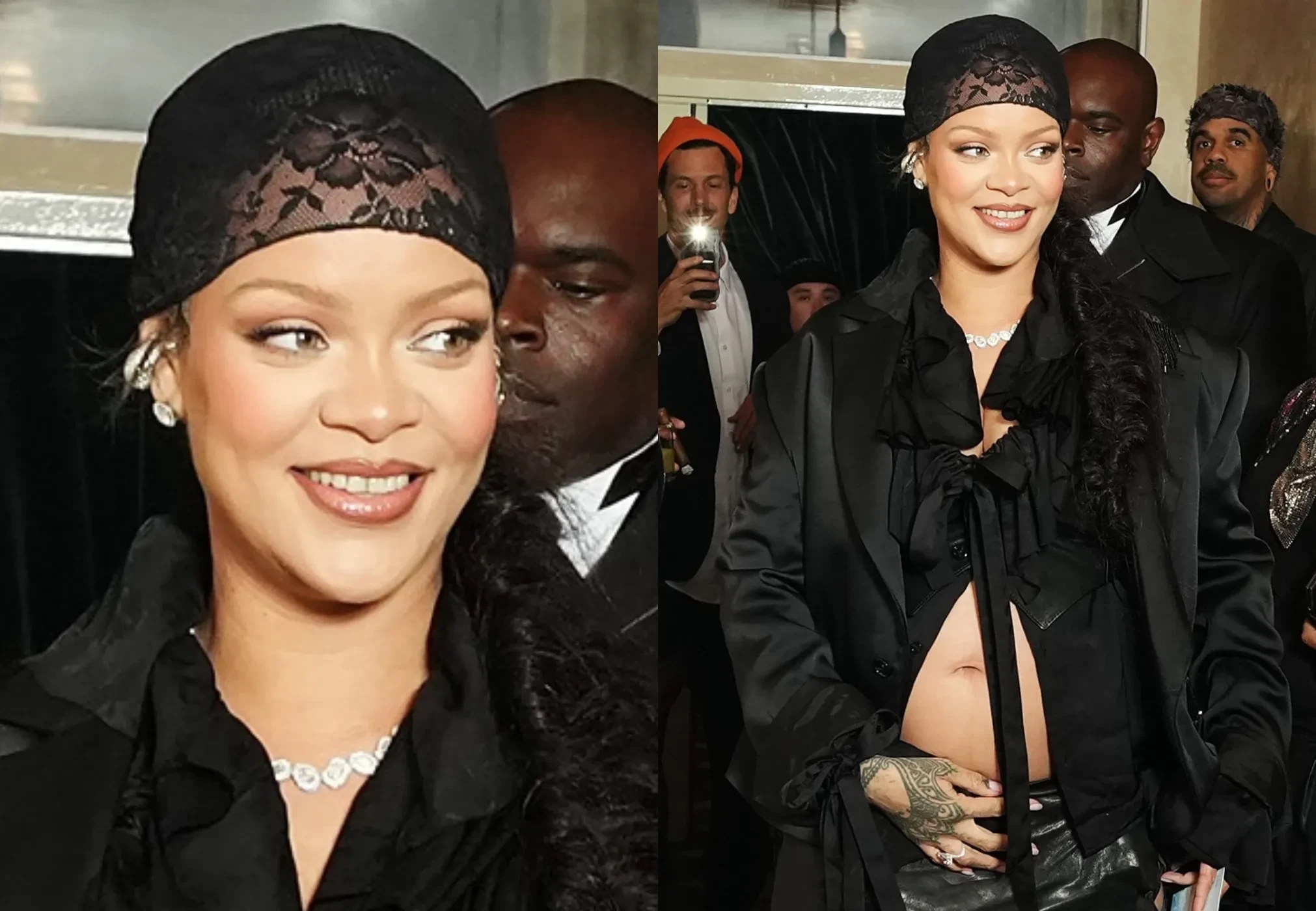 37-летняя певица, у которой уже есть двое сыновей от рэпера, появилась на афтепати в своём традиционном "беременном" образе с открытым животом. Она была одета в наряд total black с длинной юбкой, блузой с рюшами и кружевным дюрагом на голове.
