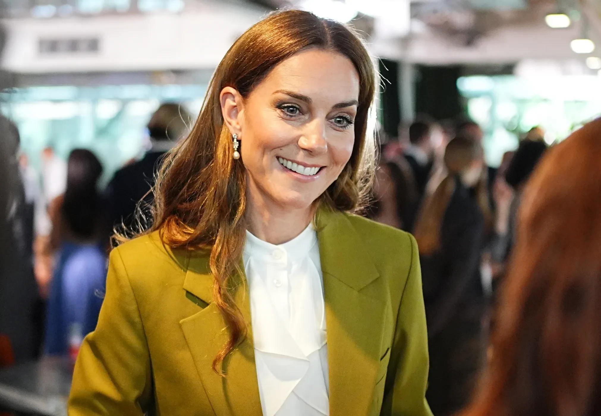 Для выхода принцесса Уэльская выбрала оливковый костюм Victoria Beckham, дополненный белой блузкой. Образ завершили бежевые туфли на шпильке Ralph Lauren и жемчужные серьги из коллекции королевы Елизаветы II.
