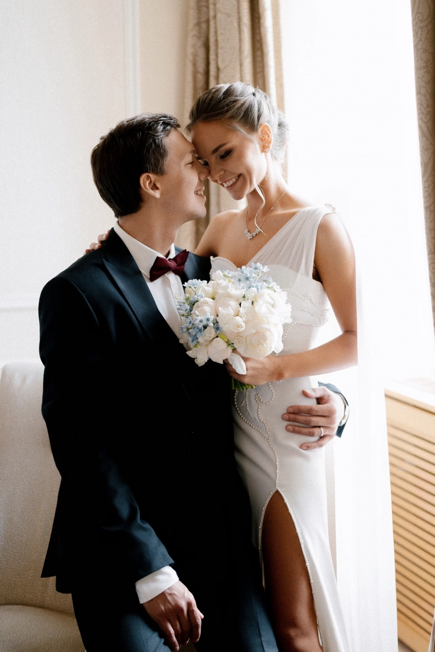 Сегодня в сети появились новые снимки со свадебной фотосессии и из ЗАГСа: фотосессия молодожёнов прошла в отеле "Балчуг Кемпински". На снимках невеста позирует в платье с разрезом бренда "Хохлома x Алёна Ахмадуллина" и в украшениях Mercury.