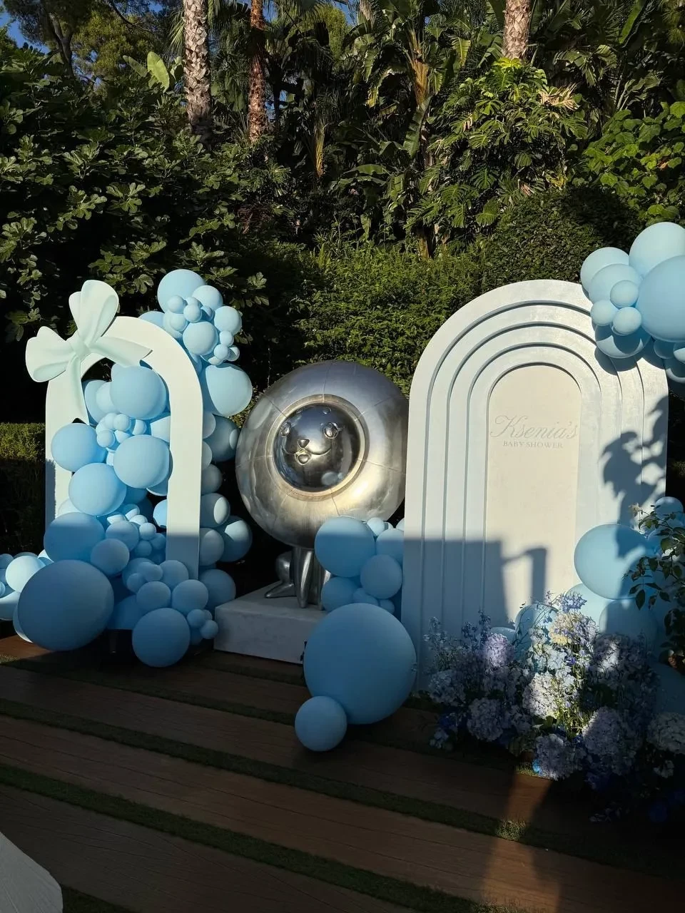Праздник проходил на Лазурном Берегу, на курорте Сен-Жан-Кап-Ферра́ на юго-востоке Франции. Среди прочих, его посетила журналистка Алёна Бердова, она же поделилась фотографиями с мероприятия. Судя по декорациям на вечеринке: голубые шары, цветы и посуда на столах, Ксения ждёт мальчика. Платье на Сухиновой тоже было нежно-голубого цвета.
