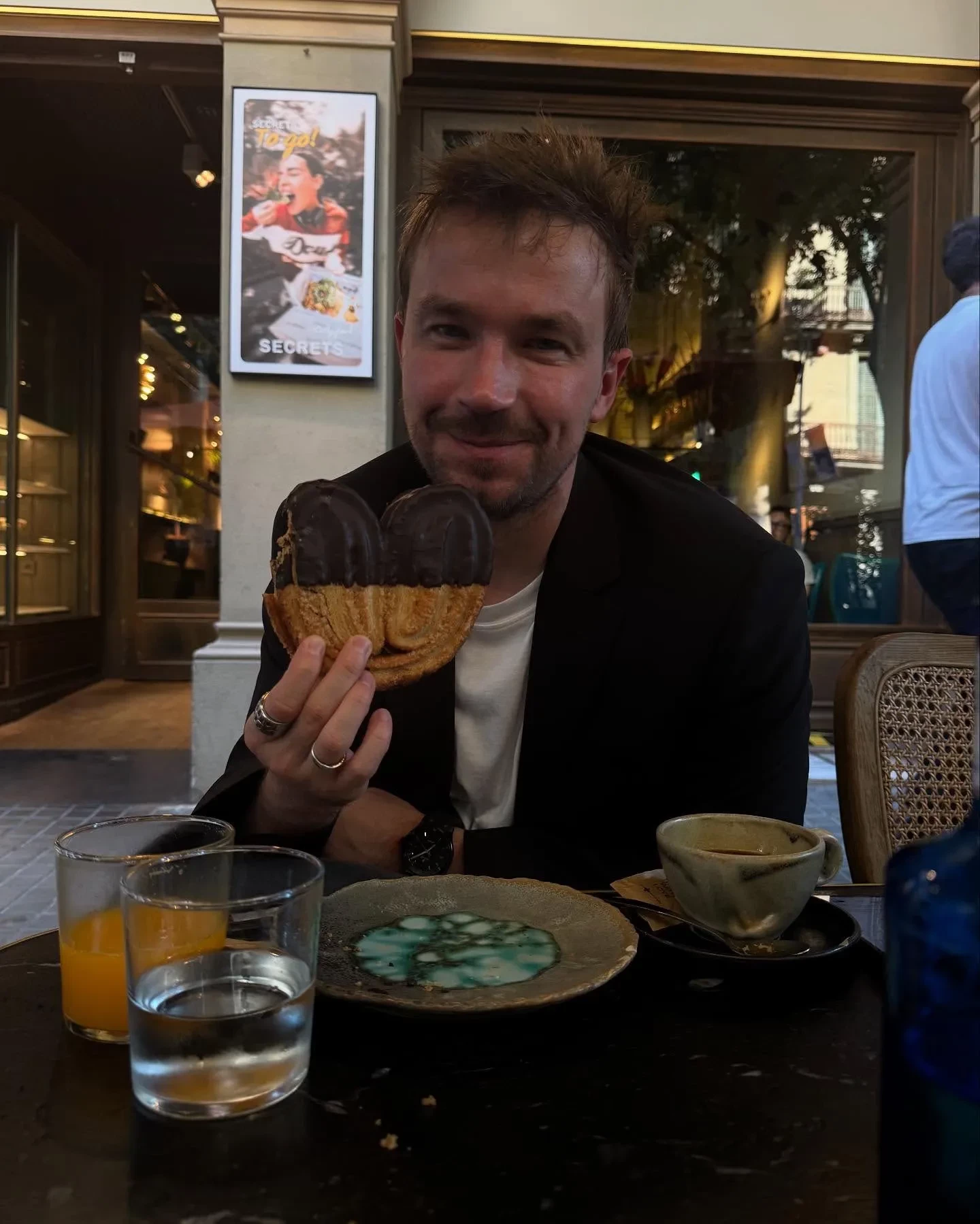 Судя по кадрам, супруги устроили романтическую прогулку по улицам Барселоны с обязательной программой в виде местных достопримечательностей вроде Кафедрального собора Барселоны и локальных кофеен — на одном из кадров 36-летний Александр позирует с плюшкой в форме сердца.