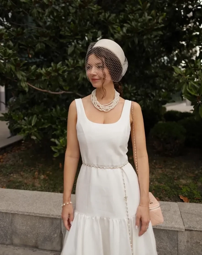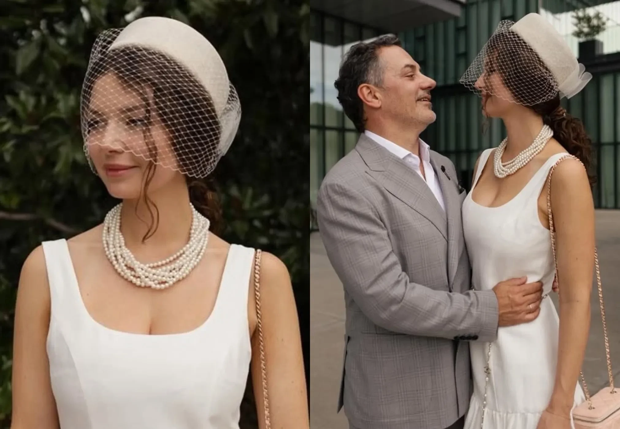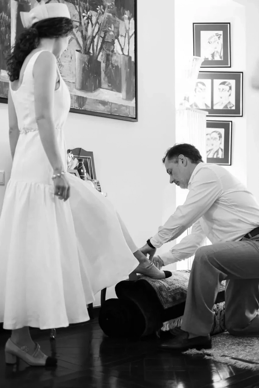 Молодожёны вместе с семьёй невесты: отцом Теймуразом, матерью Натальей и сестрой Марикой собрались на регистрации брака в Доме юстиции в Тбилиси. София надела белое платье российского бренда Roseville[b][/b]и шляпу с вуалью, дополнив образ жемчужным ожерельем, сумкой и поясом Chanel.