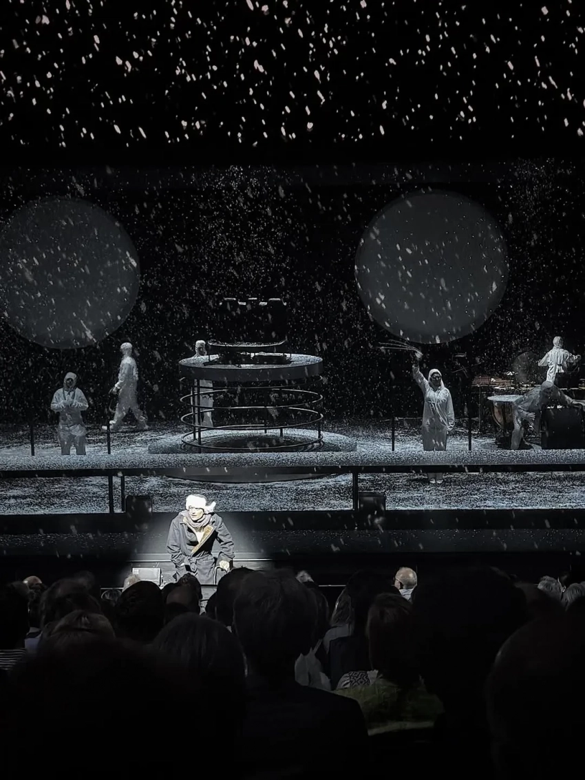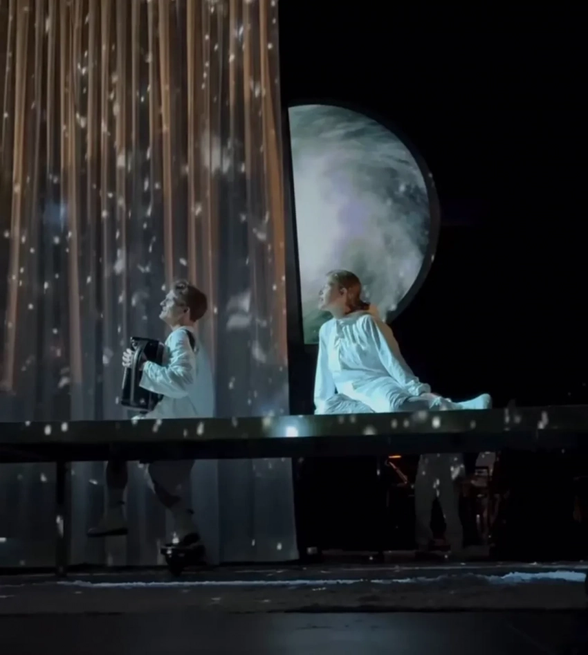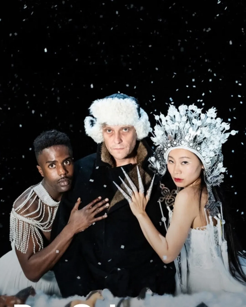 Владимир Сорокин и Кирилл СеребренниковВ спектакле "Метель" приняли участие российские актёры Варвара Шмыкова и Филипп Авдеев, а также финалистка шоу "Голос" Ян Гэ и звезда "Мастера и Маргариты" Аугуст Диль.