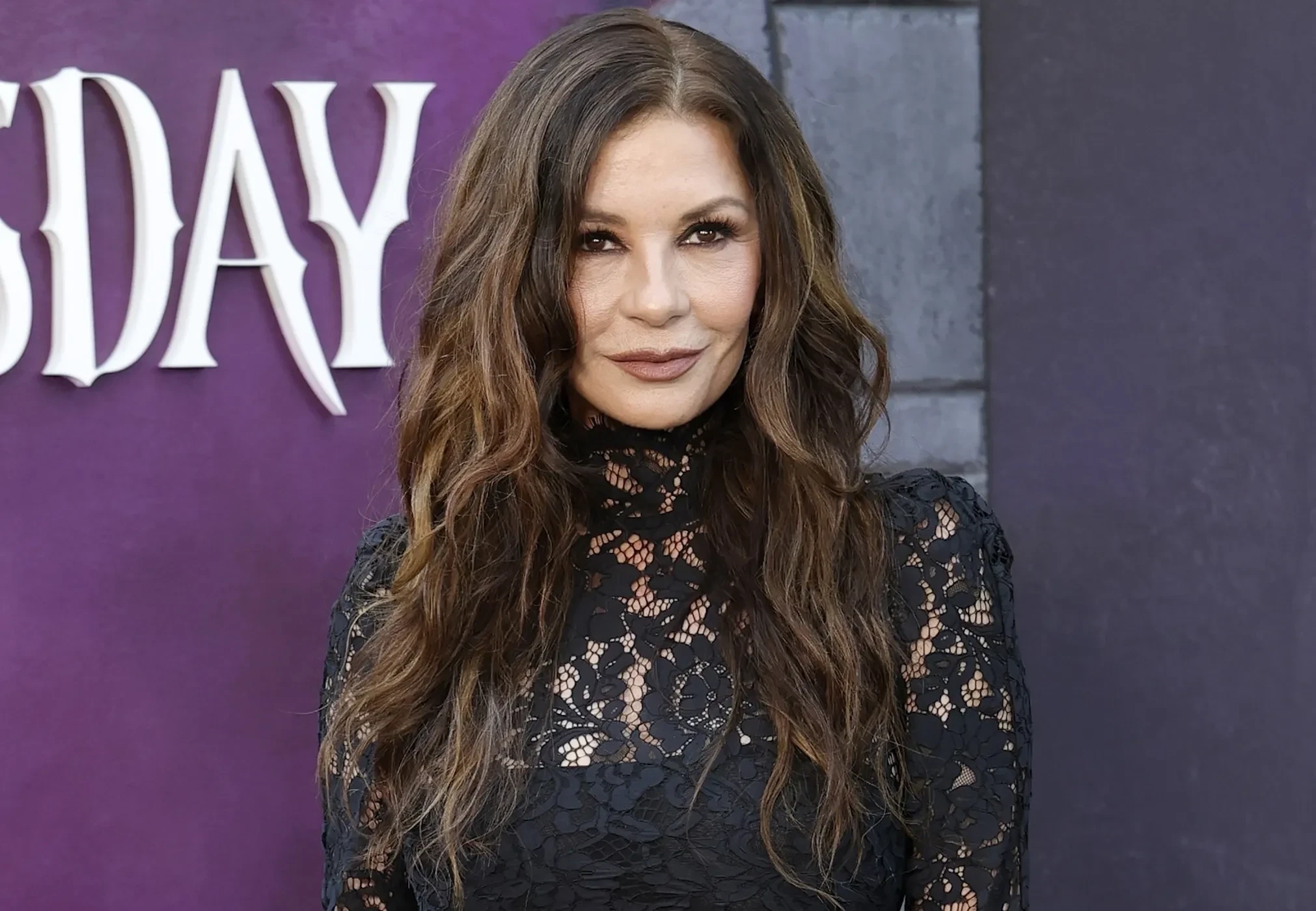 56-летняя актриса и супруга Майкла Дугласа вышла на дорожку в мини-платье из чёрного кружева и позировала с коллегами по сериалу Дженной Ортегой и Луисом Гусманом.
