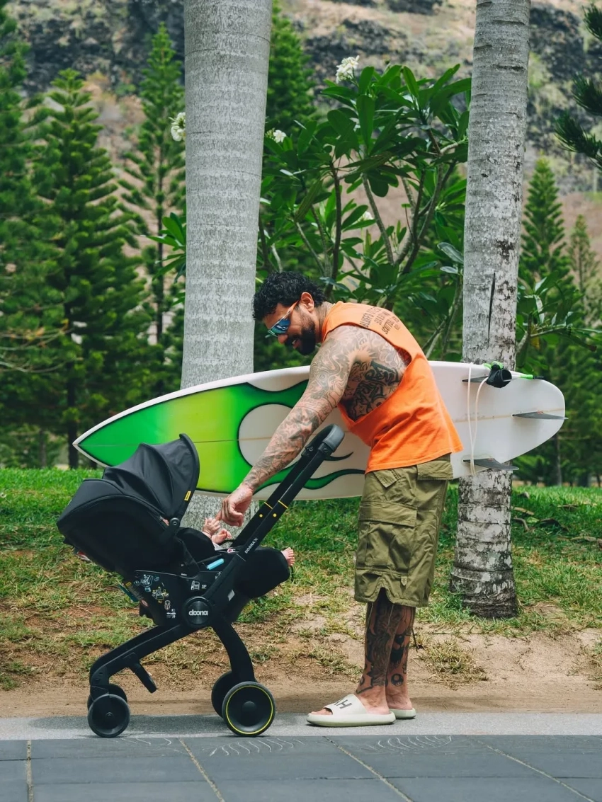 В своём инстаграме* 42-летний Тимати выложил снимки, на которых запечатлено, как он гуляет по Маврикию с переноской с трёхмесячной Эммой в одной руке и сёрфом в другой. На одном из снимков видно, что он взял с собой на морскую прогулку шестилетнего Ратмира.