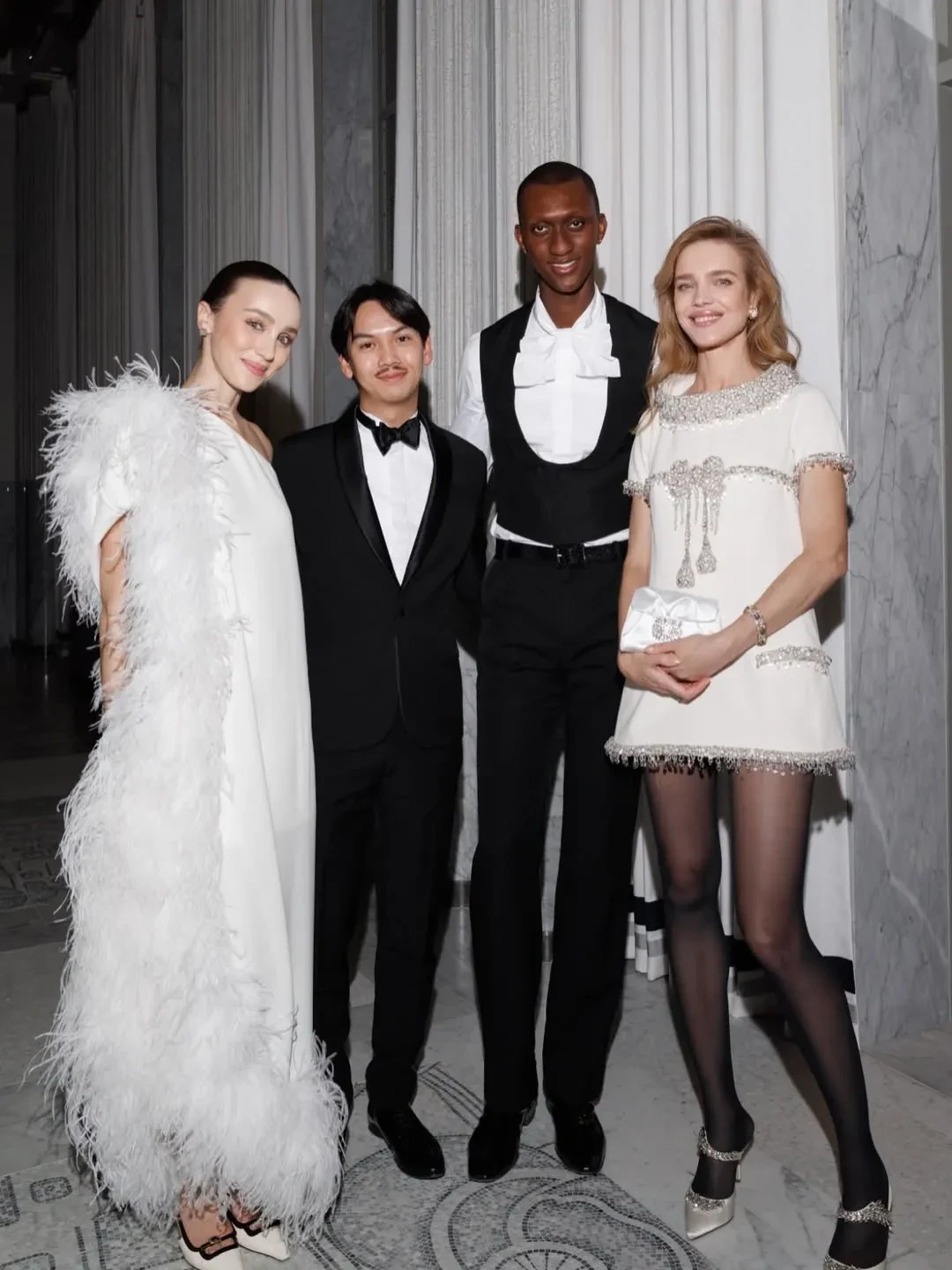 Мэри Лист, Наталья Водянова и гости вечераПри создании образа стилист супермодели Хьюго Тукас Терзиян вдохновлялся стилем Джеки Кеннеди, а также Одри Хепберн, завершив наряд "её любимыми" украшениями. "Платье придает этому образу атмосферу Джеки Кеннеди благодаря своей великолепной вышивке, вдохновлённой бантом на лифе императрицы Евгении 1855 года", — написал он в соцсетях.