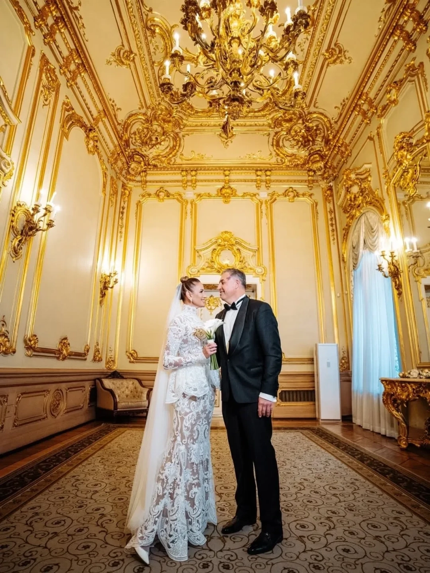 Невеста была в платье от дизайнера Александра Сирадекиана. Бракосочетание прошло в популярном среди селебрити Дворце бракосочетания № 1 на Английской набережной Санкт-Петербурга. Молодожёны также устроили фотосессию в местном пятизвёздочном отеле "Астория" и посетили храм.