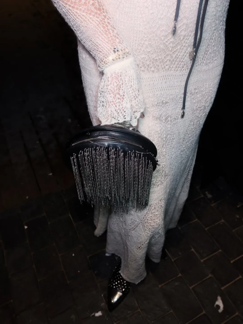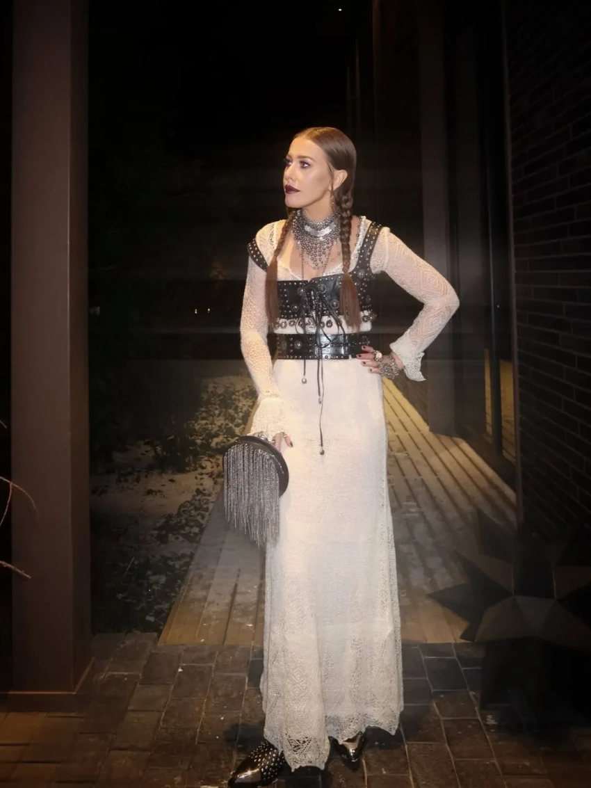 Собчак, которая в последнее время предпочитает волосы длиной до плеч, сменила причёску на длинные косы, дополнив образ кружевным платьем, кожаным бра с металлическими заклёпками и сумкой Chanel. "Как вам мой лук "готическая снегурочка"?", — охарактеризовала свой образ сама ведущая.