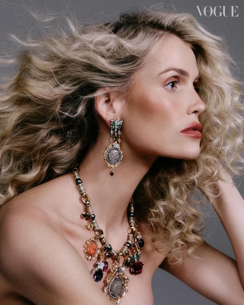 В объективе фэшн-фотографа Хорхе Эвальда 35-летняя британская аристократка позирует в нарядах и украшениях от Dolce & Gabbana. Специально для съёмки ей сделали объёмную прическу с мелкими кудрями, а также макияж с акцентом на губы.
