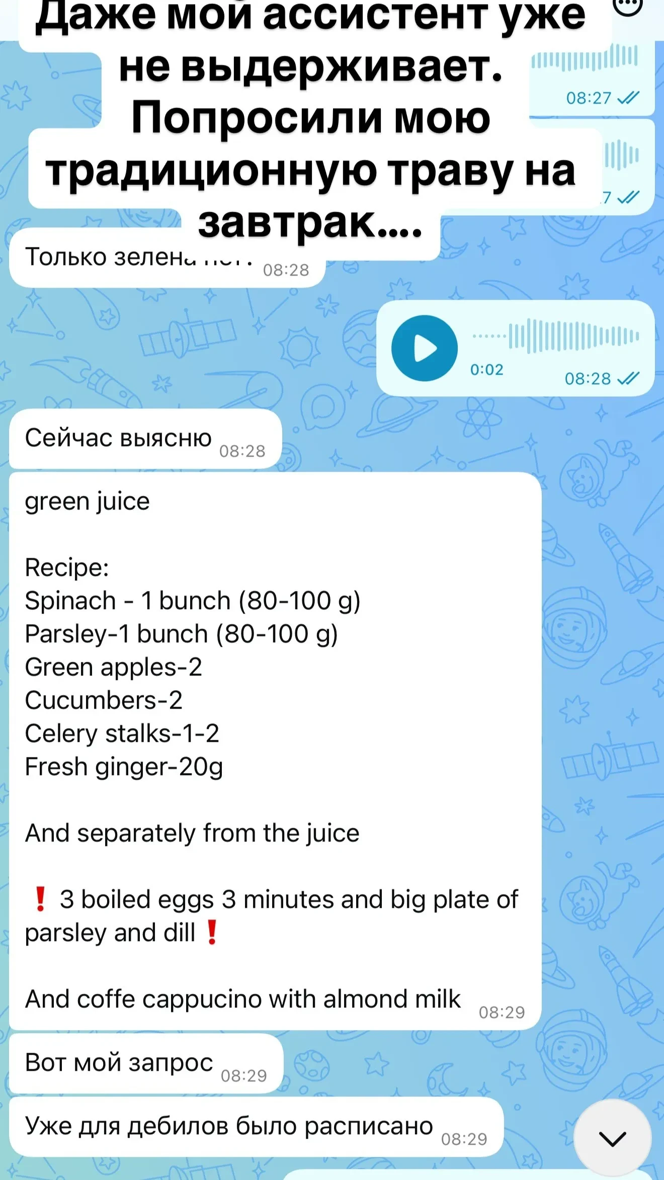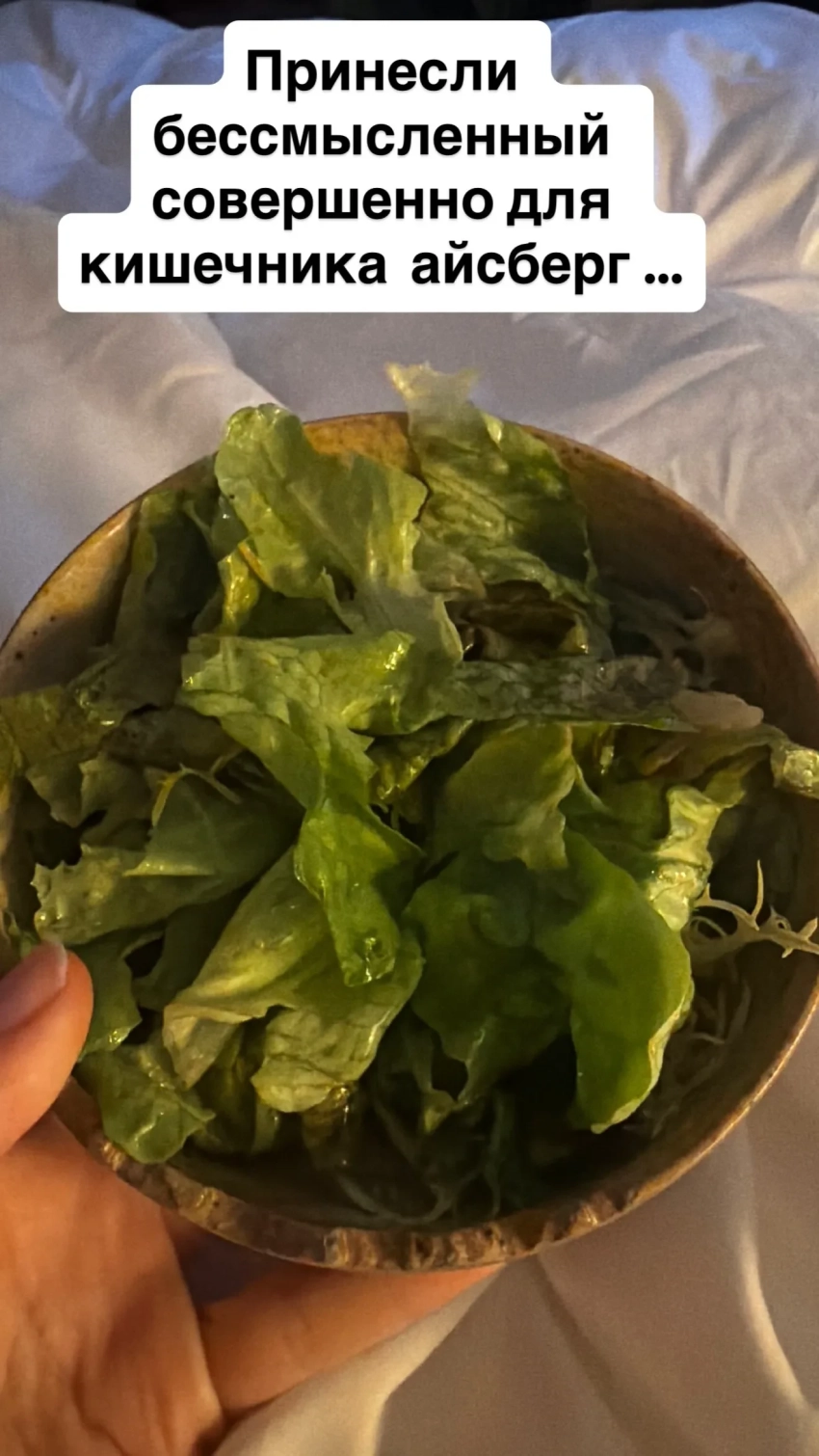 Скриншот из сторис* Ксении СобчакСобчак высказалась и по поводу питания в пятизвёздочном отеле. Помощник звезды пытался заказать ей "зелёный сок" из определённых ингредиентов (зелёные яблоки, огурец, сельдерей, имбирь, петрушка и шпинат), а также два варёных яйца, тарелку зелени и капучино, но в итоге Ксении пришлось есть салат "Айсберг". "Даже мой ассистент уже не выдерживает. Попросили мою традиционную траву на завтрак".