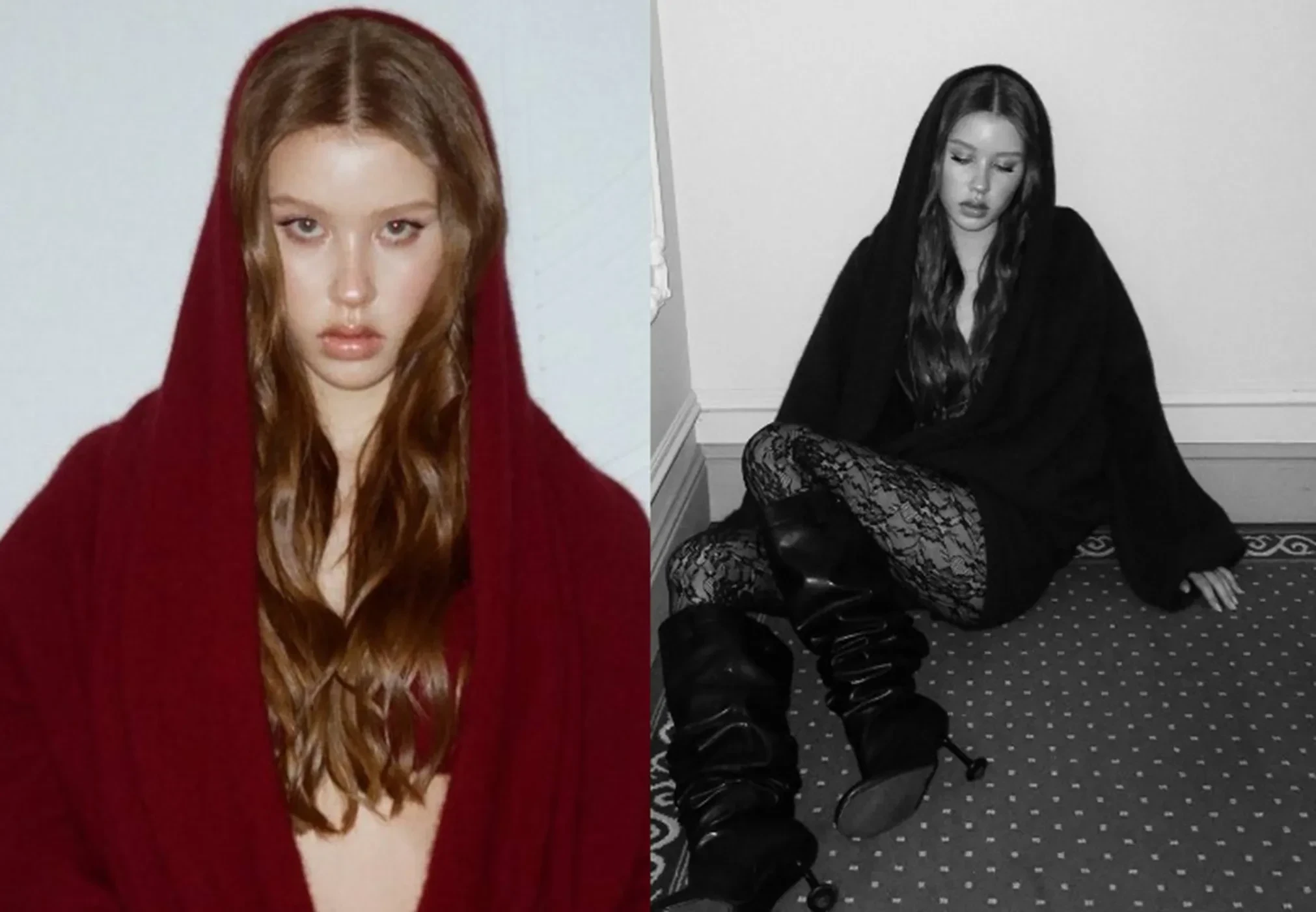 Пересильд снялась в закрытом сером платье с кожаными перчатками, а также в комплекте из вязаного лифа, джемпера и мини-шорт. Последний лук она дополнила кружевными колготками и ботфортами на каблуке.