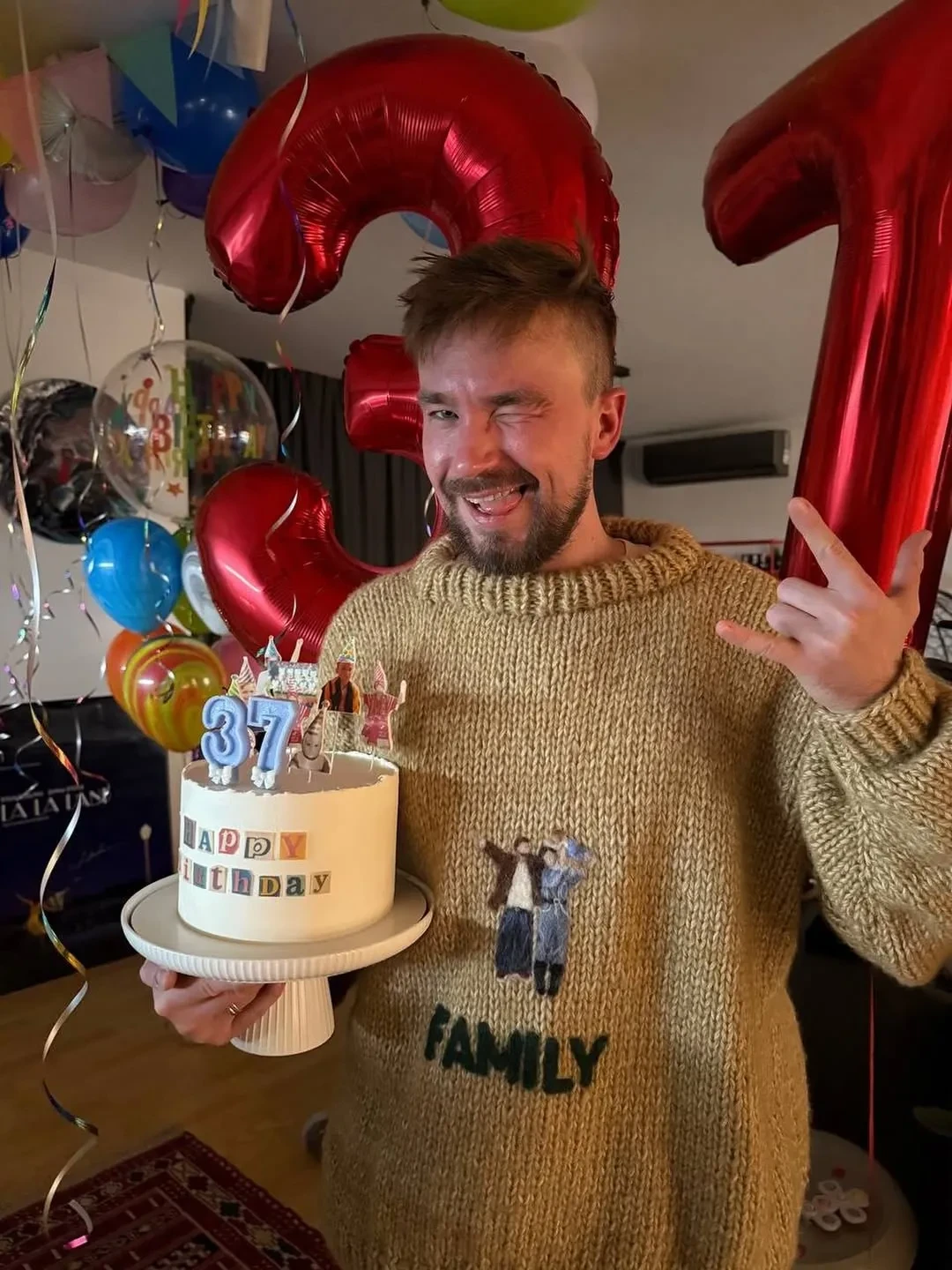 24-летняя Виктория Петрова украсила гостиную воздушными шарами и гирляндами, подарила торт с цифрой 37 и вручила картину с отпечатками ног их сына Фёдора. Актёр позировал на фото в свитере с надписью "Семья", который, вероятно, тоже подарила супруга. "Моя любовь родилась", — написала Петрова в соцсетях.