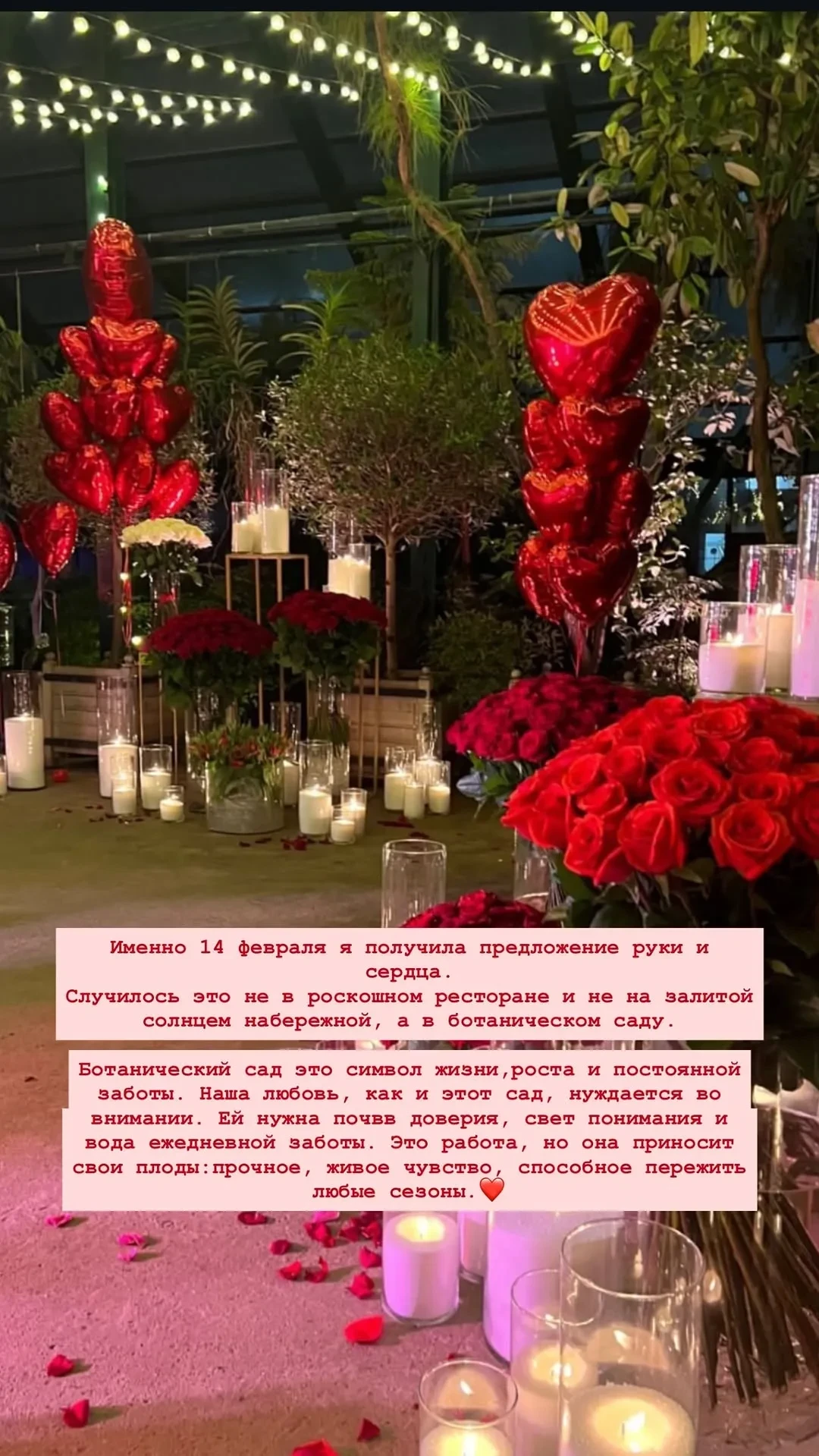 "14 февраля — это наш день. День, когда среди вечнозелёных растений было дано обещание. Обещание растить общий сад, где будут цвести уважение, поддержка и тихая радость", — написала супруга миллионера.