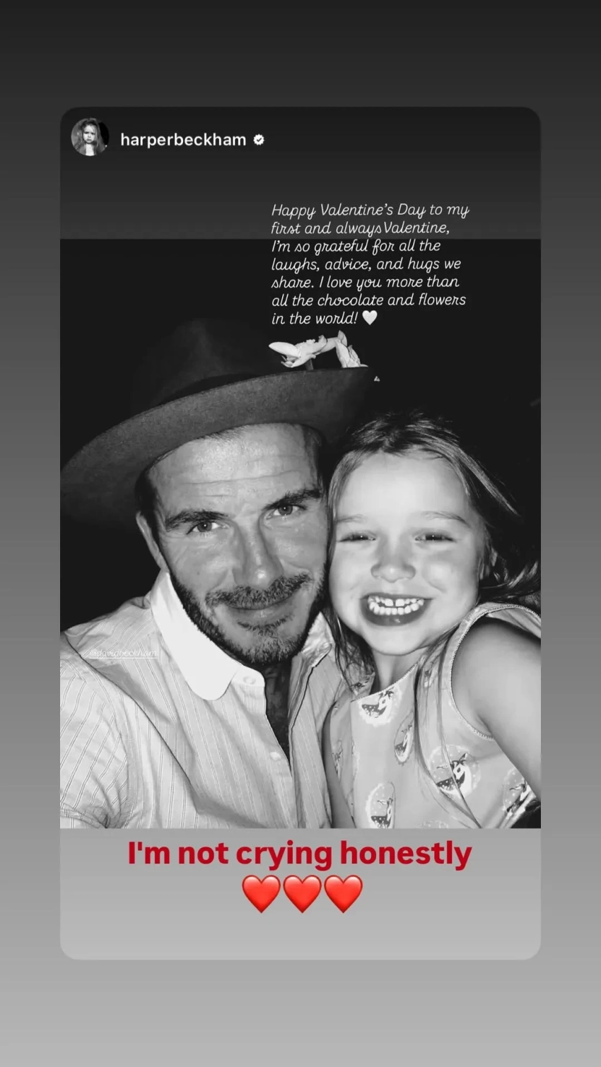 "С Днём святого Валентина моего первого и неизменного Валентина. Люблю тебя больше, чем весь шоколад и все цветы в мире", — подписала 14-летняя дочь Дэвида Бекхэма Харпер архивное фото с ним.