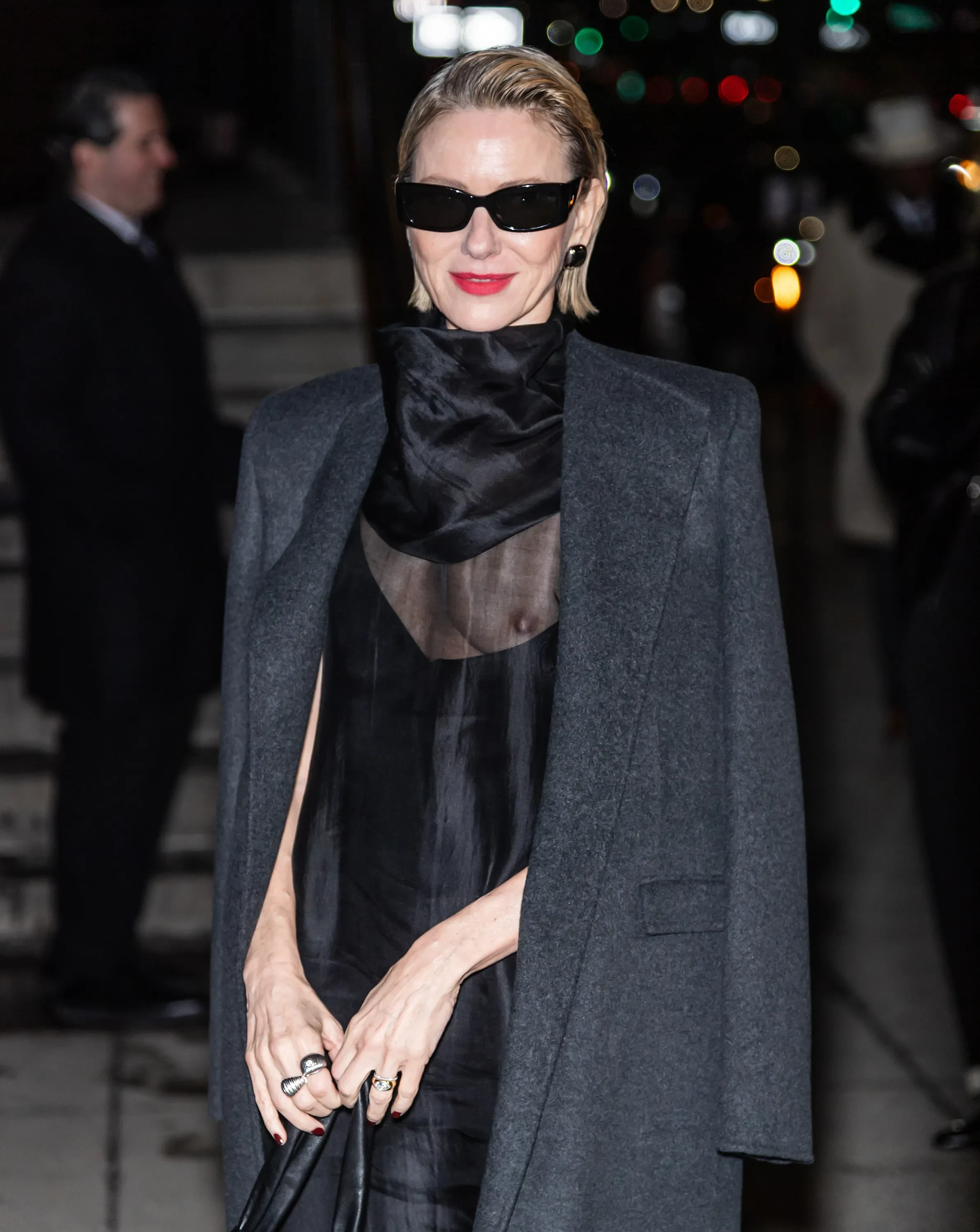 57-летняя актриса появилась на публике в чёрном платье, обнажив грудь, и сером пальто. Образ дополнили солнцезащитные очки и красная помада.