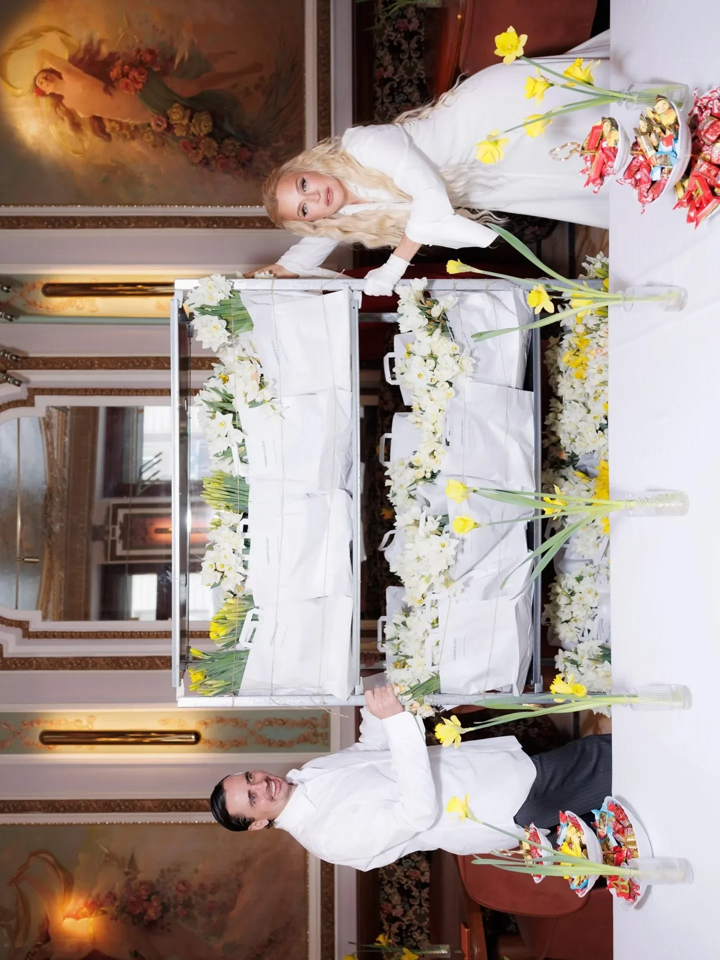 Праздничным дресс-кодом стали образы в жёлто-белой цветовой гамме, напоминающей о нарциссах, которыми было украшено всё пространство. Столы ломились от угощений: наряду с традиционными блинами и оладьями присутствующих угощали пирожками с мясом и капустой, соленьями, шоколадными конфетами и петушками на палочке, которые предлагали запивать травяным чаем и настойками.