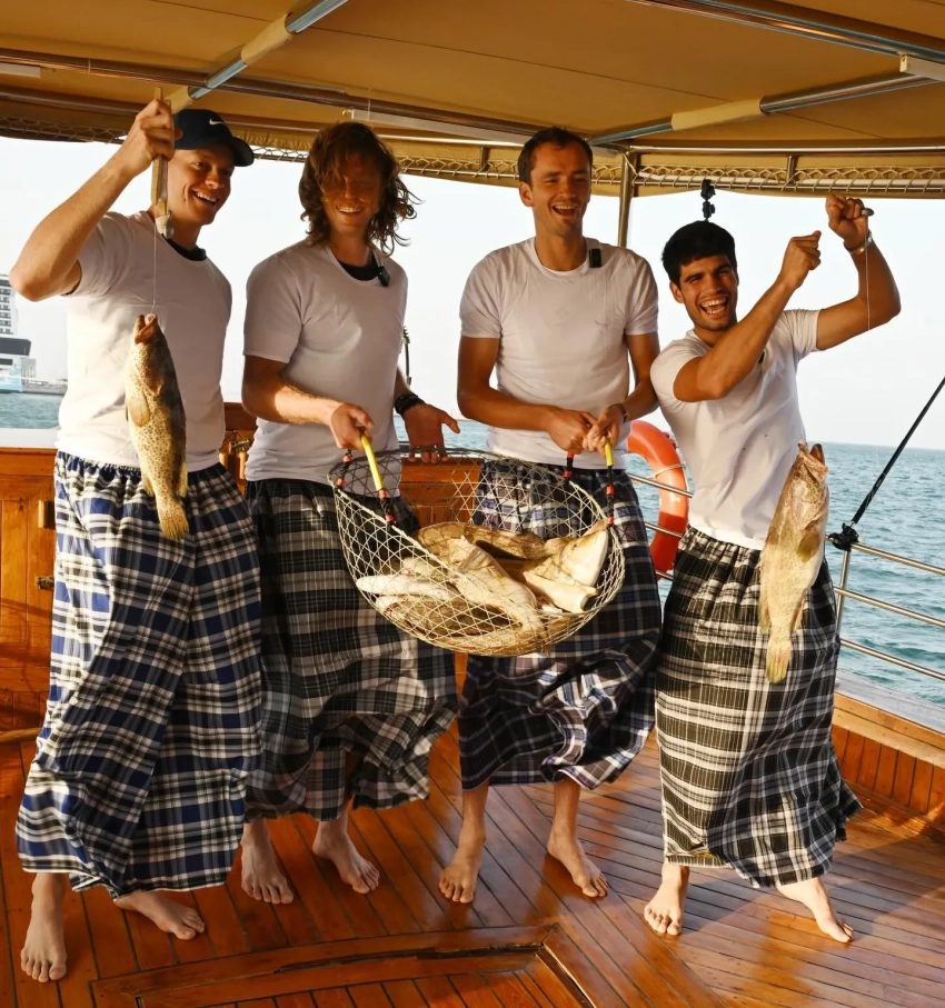 Андрей Рублёв, Даниил Медведев, Янник Синнер и Карлос Алькарас порыбачили вместе перед турниром в Дохе