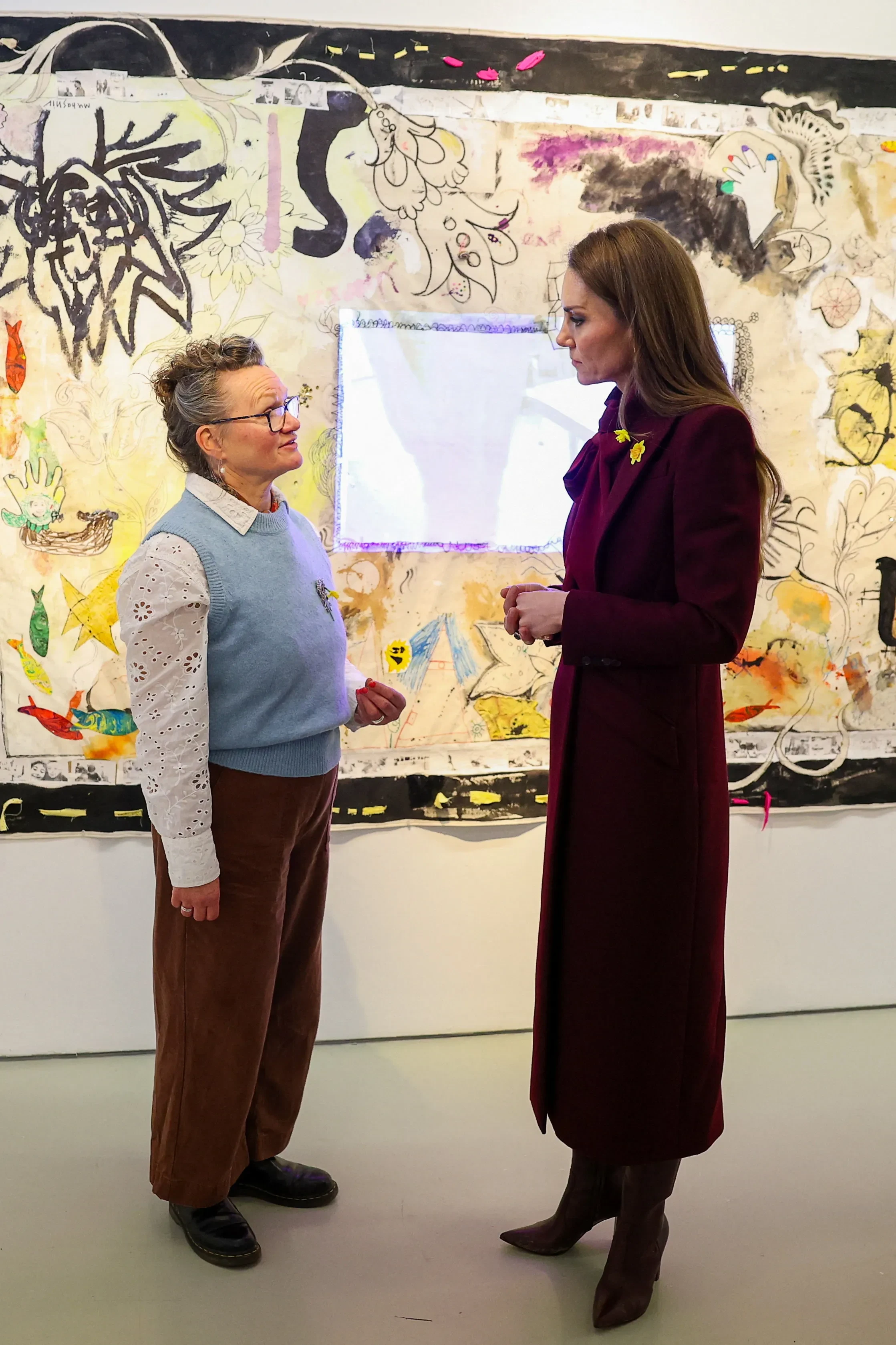Для визита 44-летняя Кейт выбрала образ в бордовых оттенках: она была в любимом красном пальто от Alexander McQueen, которое уже не раз носила на публике, блузе с бантом, макси-юбке и высоких лакированных сапогах. 43-летний Уильям предпочёл коричневый пиджак, синий джемпер и брюки прямого кроя. На груди у пары красовались одинаковые броши в виде нарциссов — символа святого Давида, который традиционно носят в день праздника как знак уважения к валлийскому наследию.