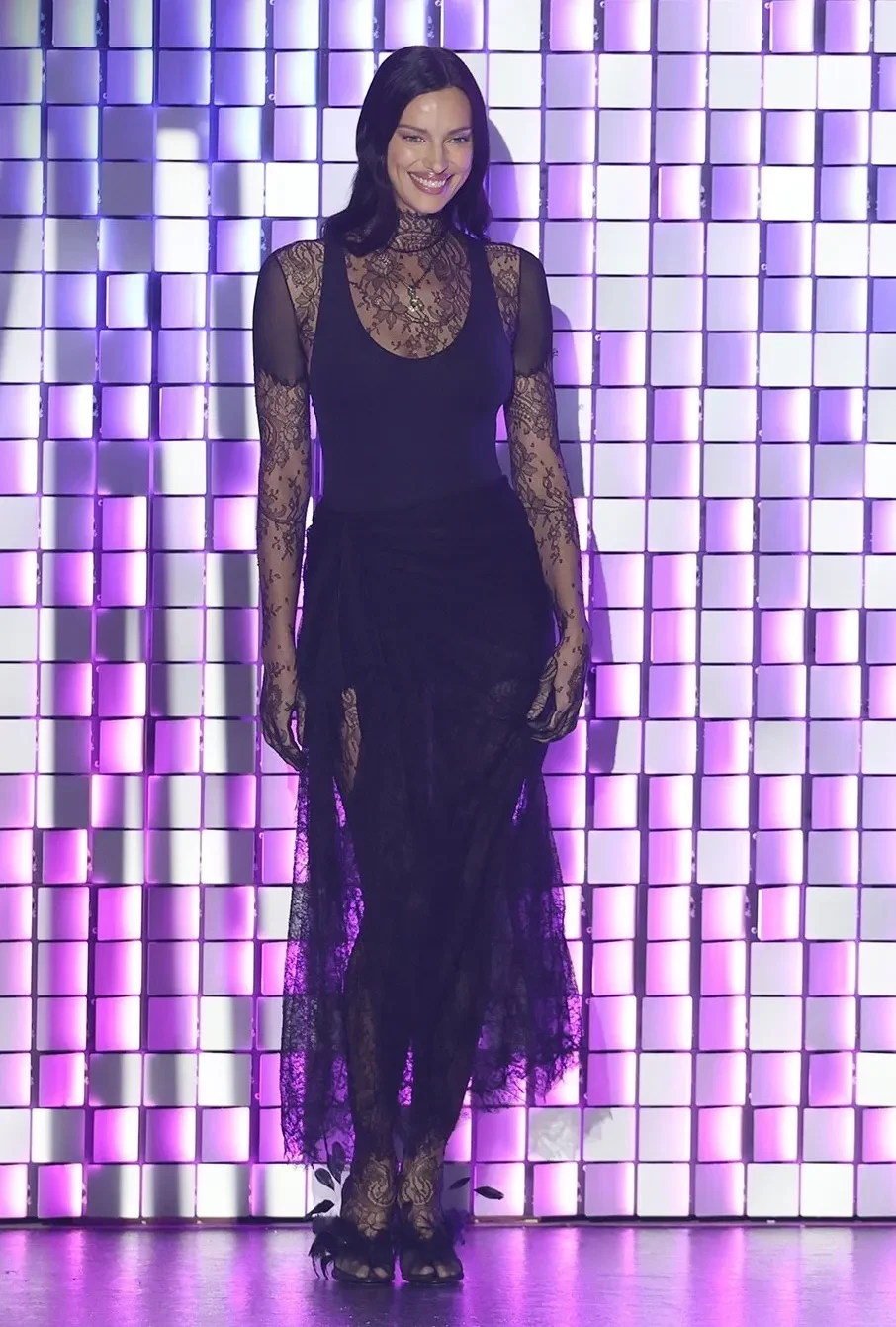 Шейк появилась в платье с глубоким декольте и с юбкой-бахромой, а потом вышла в "рабочем" платье с меховой кепкой. Также звезда подиумов примерила платье с кружевом и прозрачной юбкой и "закрытый" наряд с золотой бахромой. Образы звезды, которые создал её друг, дизайнер и бывший креативный директор Givenchy Риккардо Тиши, дополнили золотой медальон и бриллиантовый гриллз в зубах.