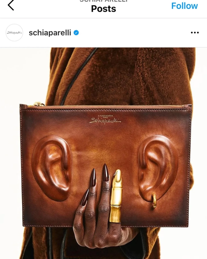 Сумка Джозефинны ЭмбройдериПримечательно, что в 2021 году вокруг Schiaparelli уже бушевал похожий скандал. Тогда бельгийско-грузинский художник Шалва Никвашвили обвинял марку в плагиате его сумок с аппликациями "ушей", однако ему так и не удалось добиться широкой огласки истории.