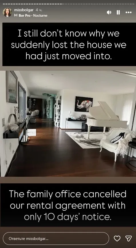 "Я до сих пор не знаю, почему мы вдруг потеряли дом, в который только что переехали. С нами расторгли договор аренды, уведомив об этом всего за 10 дней", — написала Болгар, имея в виду элитный особняк в Швейцарии, где она ранее жила с детьми и который им пришлось покинуть после разрыва с Дуровым.