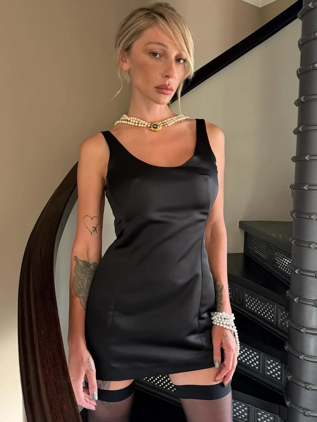 Сторис* Насти ИвлеевойВпрочем, отсутствием вычурности отличался не только десерт, но и образ именинницы: 35-летие Настя встретила в спортивном оверсайзе, хотя уточнила, что "платье было, но к караваю гоповская сущность взяла верх". "До каравая" она позировала для праздничных кадров в чёрном атласном мини-платье, которое дополнила чулками, туфлями на каблуках, колье и браслетом из жемчуга.