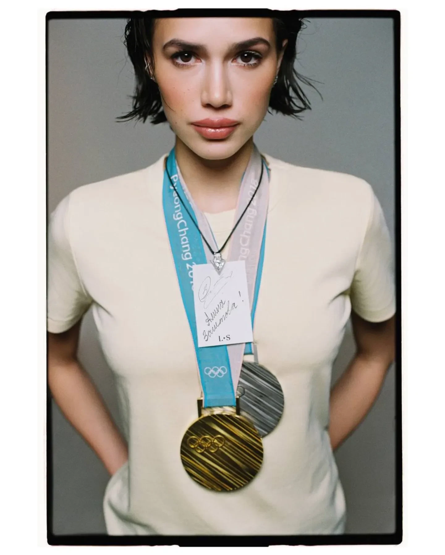 Алина ЗагитоваАрхангельская рассказала Ксении Соловьёвой, почему решила добавить медали в кадр: "Многие бренды фотографируют свои продукты на фоне, скажем, полосочек с логотипом Miu Miu. Считается, что соседство с биг-брендами придаёт статуса в глазах зрителя. А я вот уверена, что круче соседства, чем у серебряного "Бейджа" Letters and Stones, быть не может". Она также добавила, что эта идея возникла уже во время фотосессии, а реализовать её помогла бабушка Загитовой, которая оперативно привезла награды в студию.