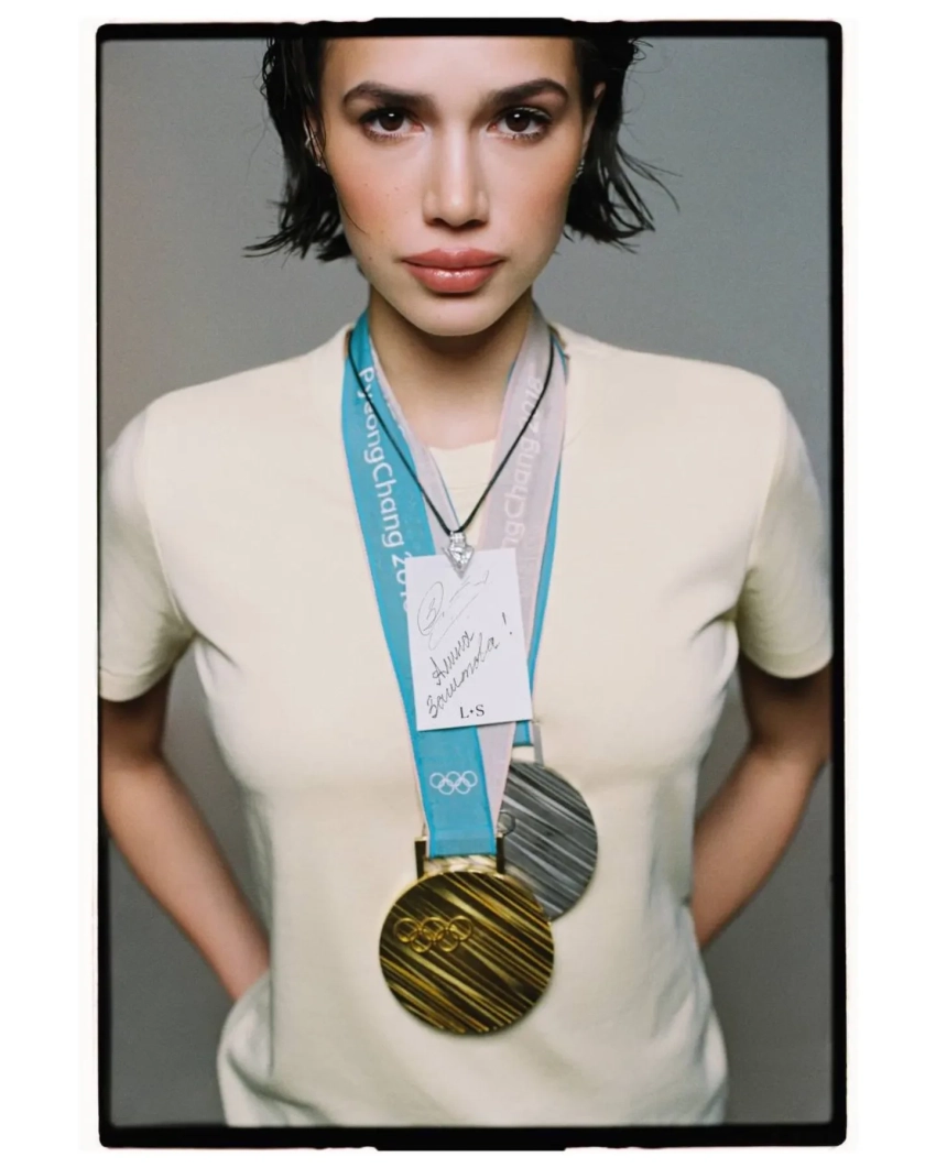 На снимках 23-летняя фигуристка позирует в чёрном боди, джинсовом комплекте, а также в плаще и прозрачном топе на "голое тело", демонстрируя украшения марки. Однако главным акцентом стали олимпийские медали, завоёванные на Играх 2018 года в Пхёнчхане: золото в личном турнире и серебро в командных соревнованиях.