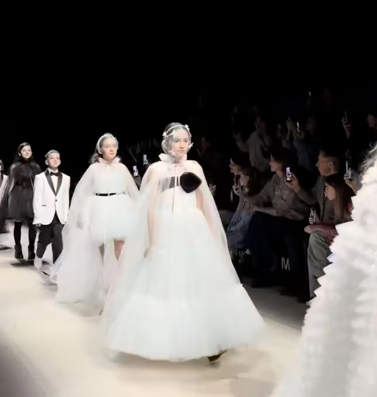 https://t.me/spletnik2006/50834Мия ПрилучнаяМия продефилировала в пышном белом платье с акцентной черной лентой, украшающей лиф. Поверх плеч была надета прозрачная накидка в пол, а лицо обрамляла вуаль в белую сетку с бабочками.