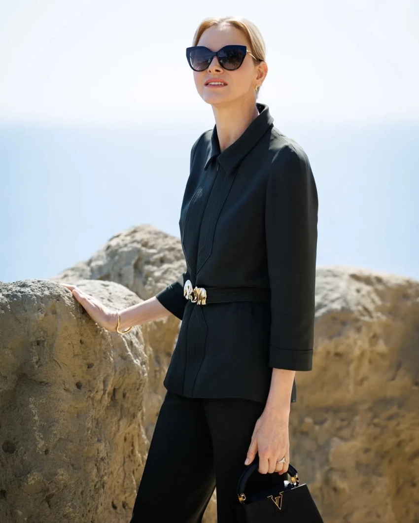 48-летняя княгиня Шарлен появилась на публике в тёмно-зелёном брючном костюме Elie Saab и туфлях на каблуках. Образ дополнили солнцезащитные очки и золотые серьги. 68-летний князь Альбер II был одет в синий костюм с галстуком, солнцезащитные очки и шляпу.