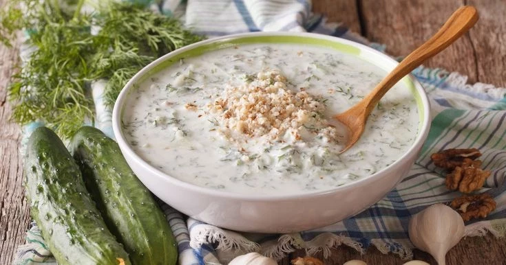 Таратор — брат дзадзики, но в супе. Йогурт, огурец, чеснок, зелень и… грецкие орехи! Орехи делают его более питательным и сытным. Суп отлично утоляет жажду, а благодаря пробиотикам поддерживает микрофлору кишечника.