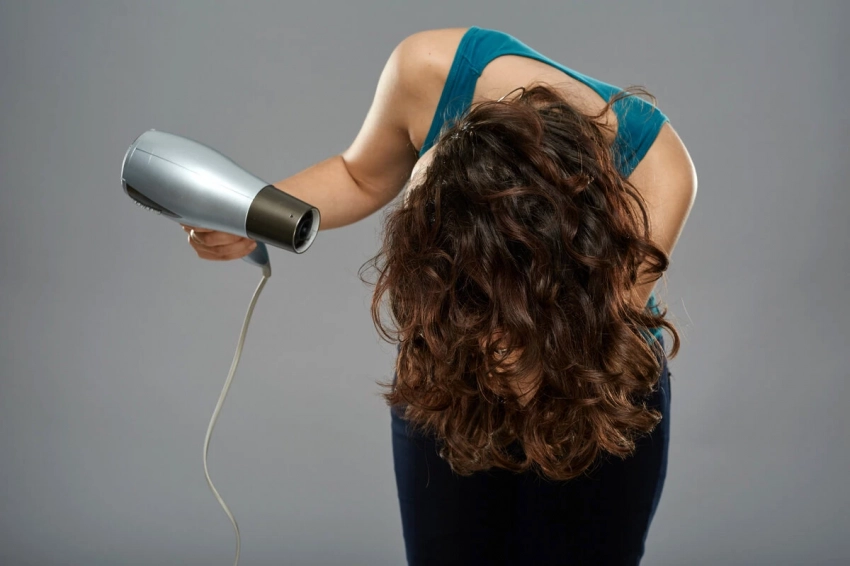 • Наклони голову вперед и суши волосы феном от корней к кончикам, помогая пальцами или расческой.