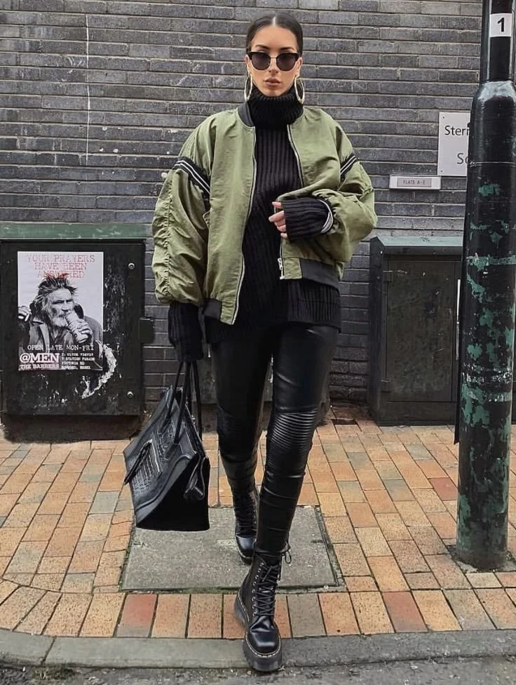 Объемный бомбер отлично сочетается с облегающими низами. Кожаные леггинсы и свободный спортивный бомбер + базовые кроссовки — удобный и модный комплект для активного дня.