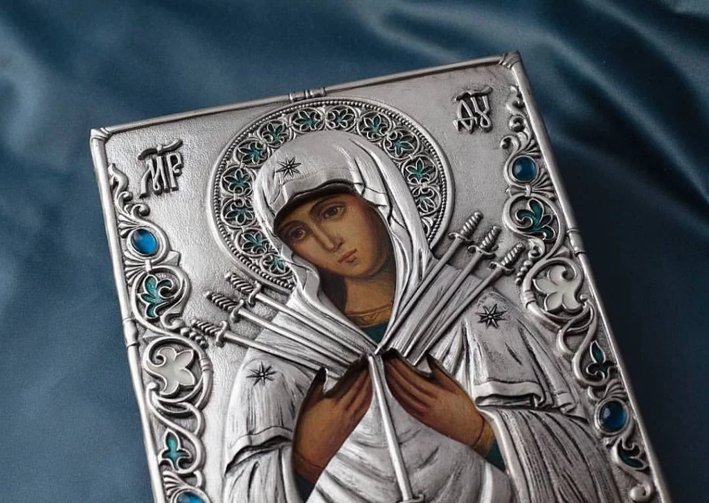 Икона Богоматери «Семистрельная» обладает глубоким духовным смыслом. На этом древнем образе Пресвятая Дева изображена с семью стрелами, пронзающими её сердце. Её второе название — «Умягчение злых сердец» — отражает особую силу иконы: она помогает смягчать душевные страсти и очищать сердце от грехов.